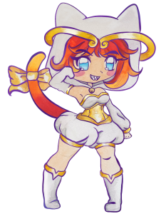 She’s hot headed! She’s a tomboy who hates frilly girl things on her but she doesn’t mind it on others. She has a heart of gold and biceps of steel.